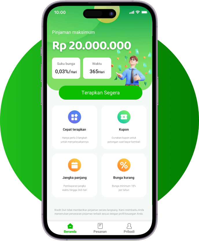 - Izin Notifikasi Kami dapat meminta izin notifikasi untuk mengirimkan informasi penting kepada Anda secara tepat waktu, seperti perkembangan pinjaman, pembaruan kebijakan, dan peringatan risiko. Penolakan izin ini tidak akan memengaruhi pengajuan atau penggunaan pinjaman Anda, tetapi dapat mengakibatkan Anda tidak menerima informasi penting secara tepat waktu. Izin ini tidak mengumpulkan informasi pribadi Anda dan hanya digunakan untuk notifikasi terkait pinjaman.